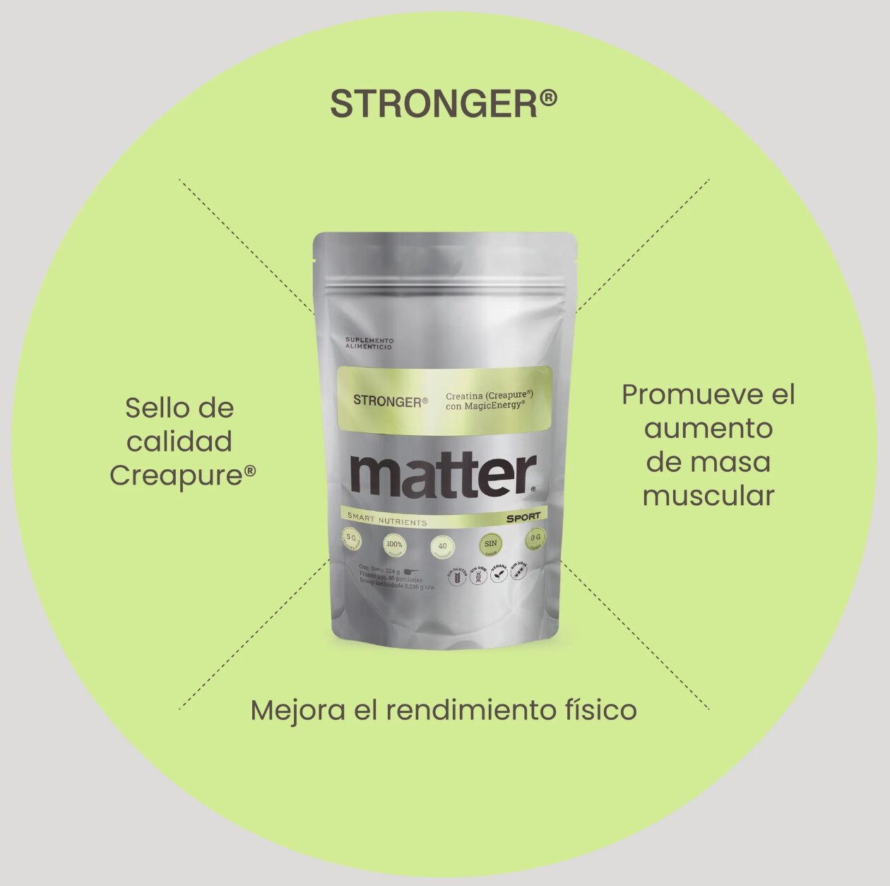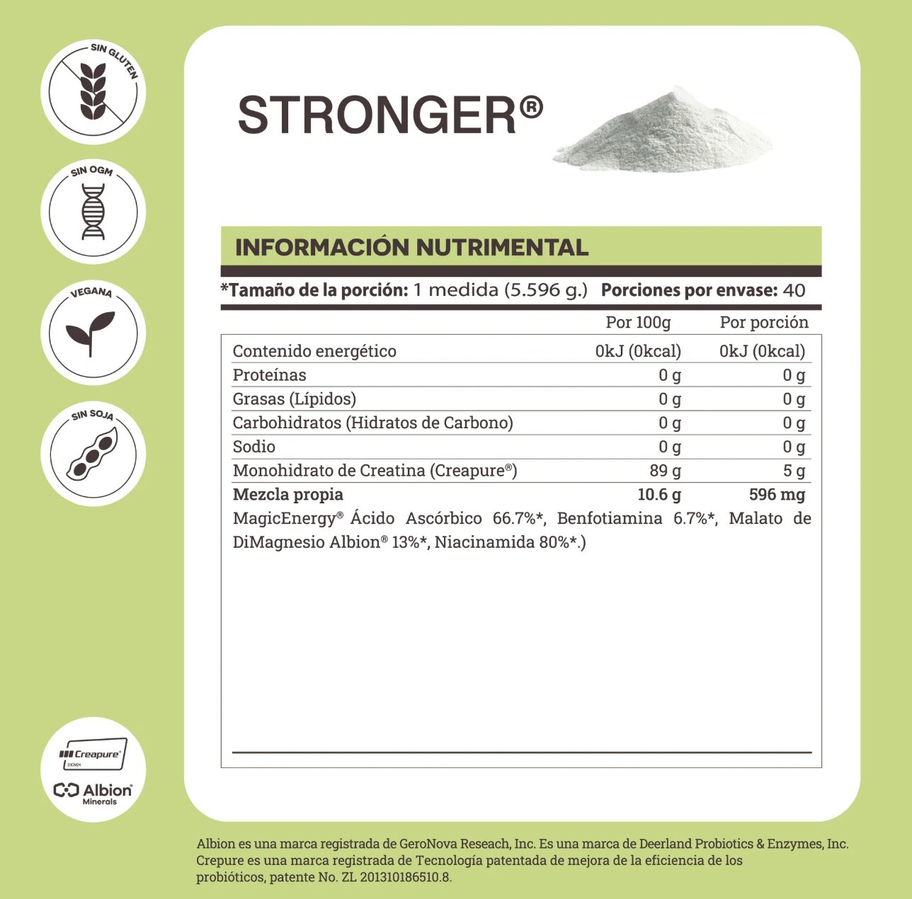 - Stronger cuenta con vitaminas C, B1, B3 y magnesio quelado para un mayor apoyo energético en el entrenamiento